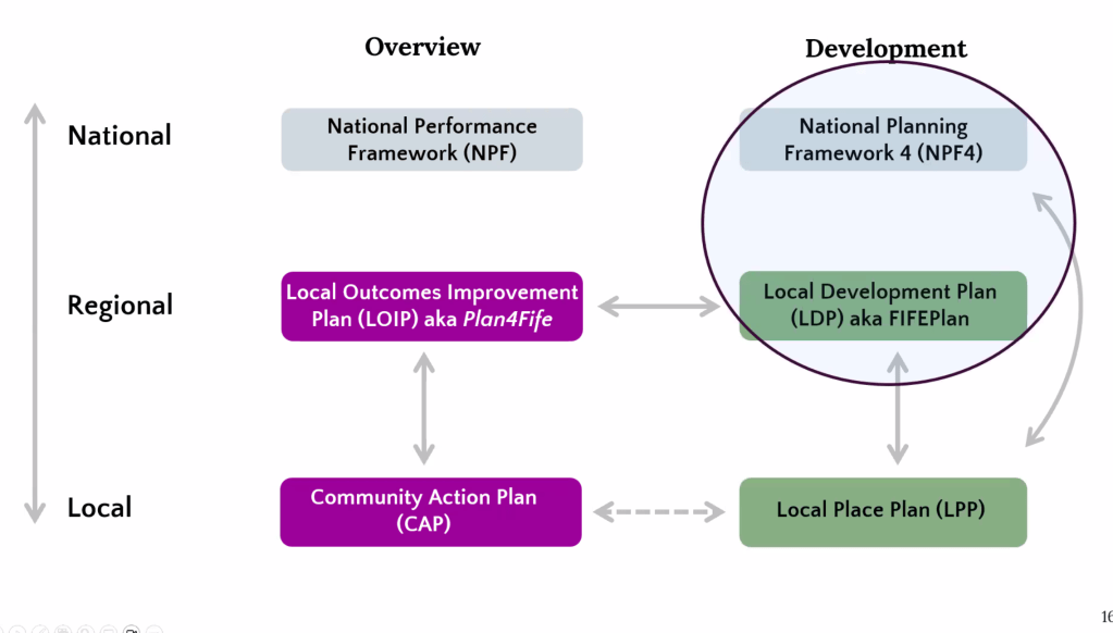 The LPP also helps inform the Local Development Plan (LDP), which is a plan for land use created for the region by Fife Council. The local authority will soon update the LDP for Fife. The LDP is guided by the National Planning Framework (NPF4) which contains a number of important policy themes and aims to create a model set of rules and aims for community development across Scotland, set by the Scottish Government.