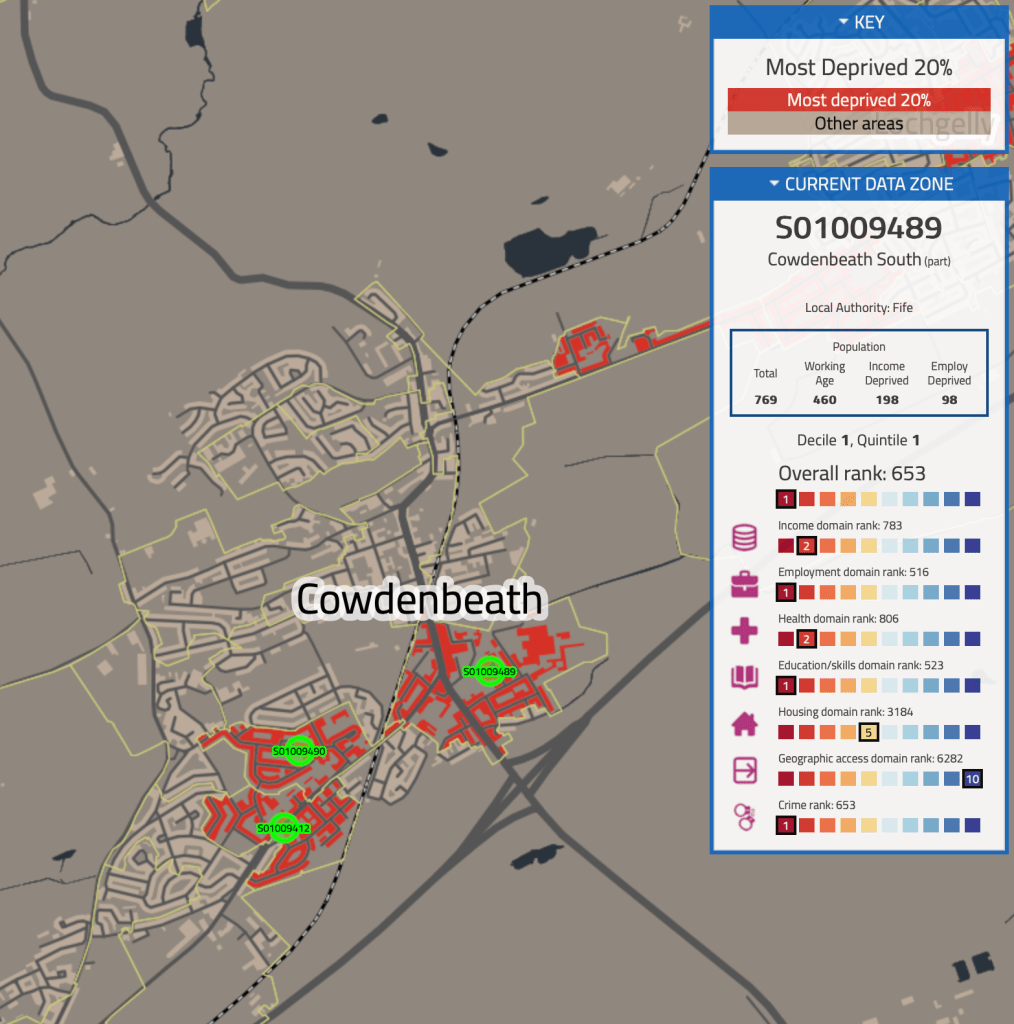 According to the latest statistics available, around 22% of the population of Cowdenbeath live in the Most Deprived 20% SIMD postcodes in Scotland.