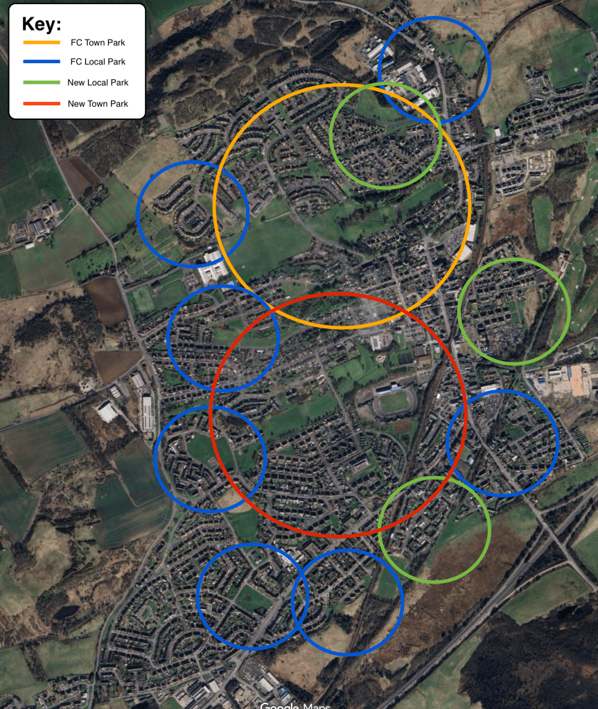These areas have specific neighbourhoods and have distinctive provision outwith safe walking distance of other parks in under 10mins for children.