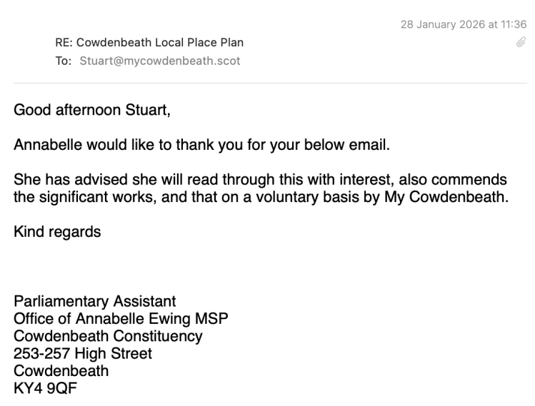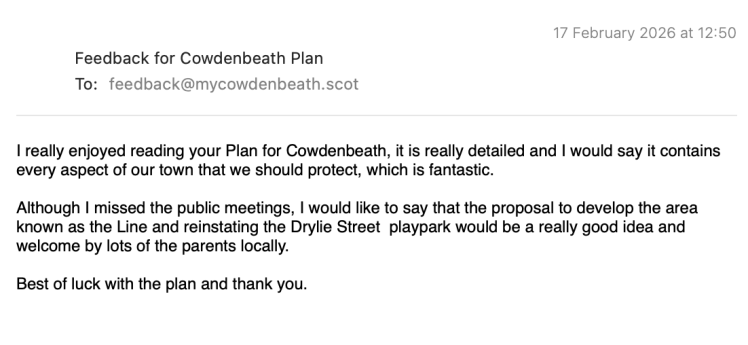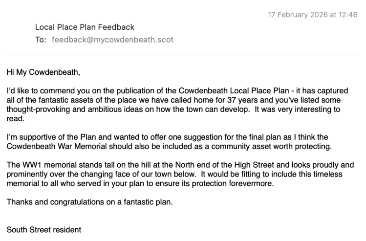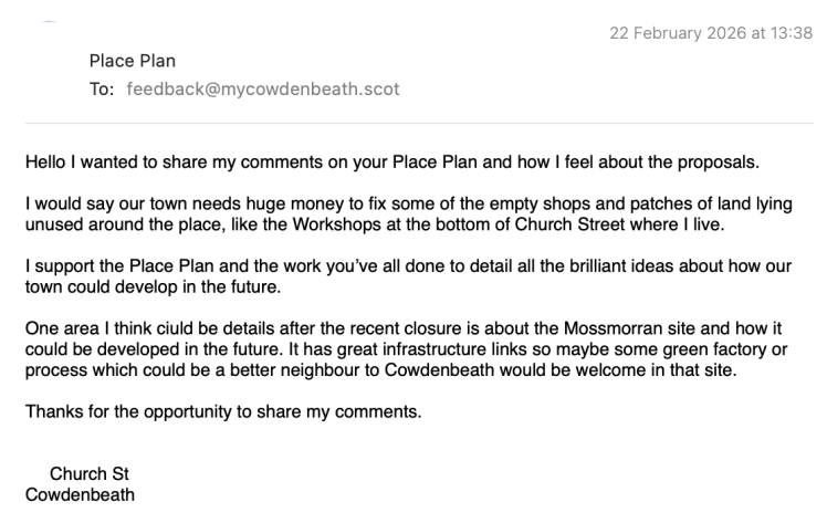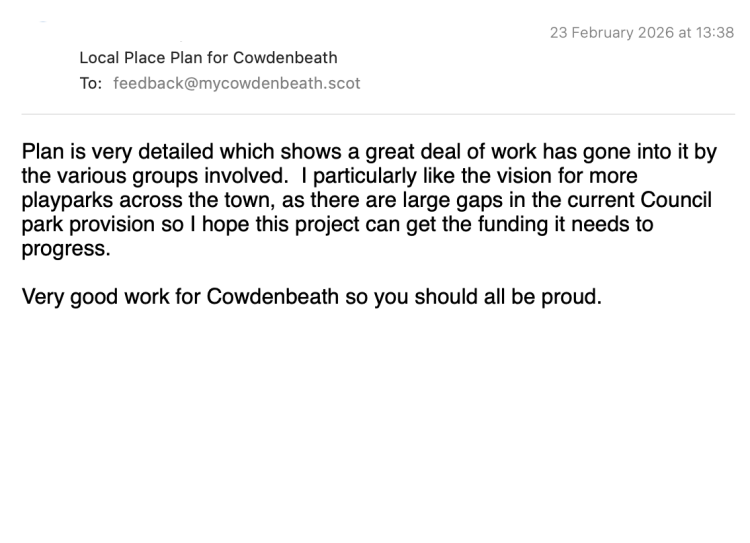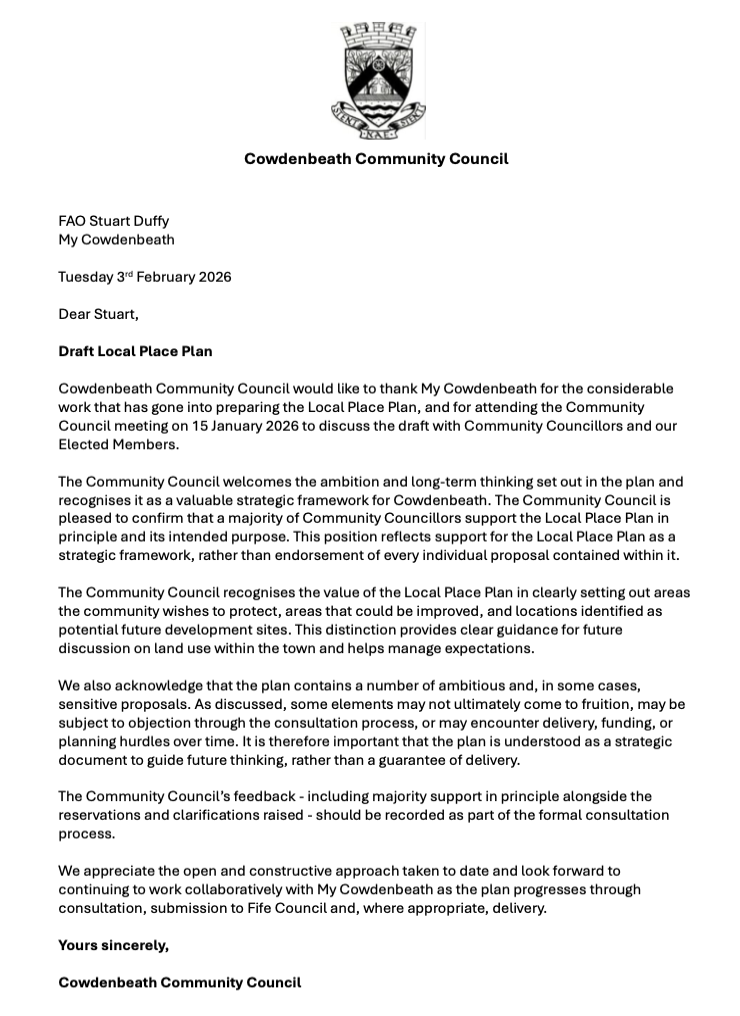 The following feedback was received as part of the community engagement stage by My Cowdenbeath on the Draft Local Place Plan for Cowdenbeath, which was open for public comments from 19th January til 23rd February 2026.