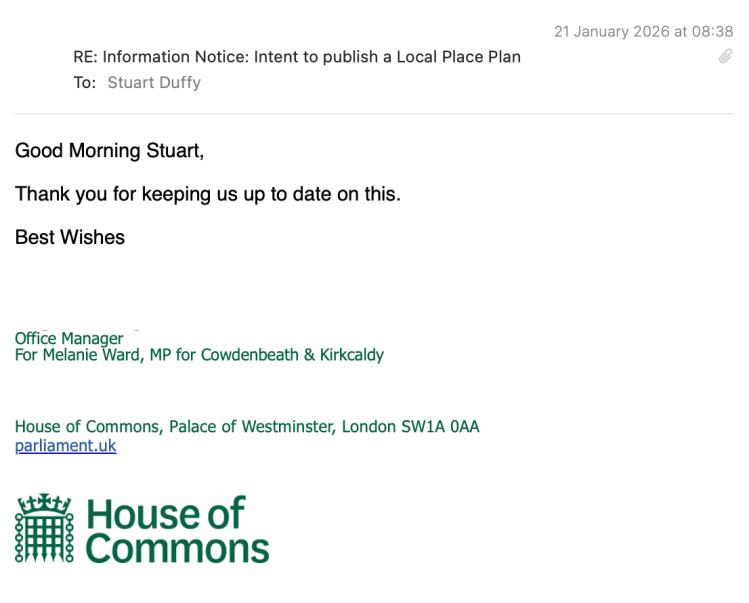 The plan was circulated to all local elected members, including Ward 7 Fife Councillors, Melanie Ward MP, Annabelle Ewing MSP, Cowdenbeath Community Council and other stakeholders in compliance with the requirements for a Pre Submission Notice.